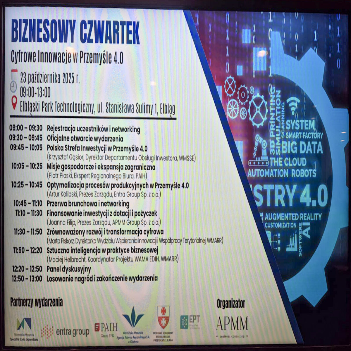Cyfrowe innowacje, sztuczna inteligencja i optymalizacja procesów produkcyjnych – to kluczowe tematy, które zdominowały wczorajszy (23.10) „Biznesowy Czwartek” w Elbląskim Parku Technologicznym. Warmińsko-Mazurska Specjalna Strefa Ekonomiczna była Partnerem merytorycznym tego spotkania, wskazując na konkretne źródła finansowania transformacji cyfrowej.