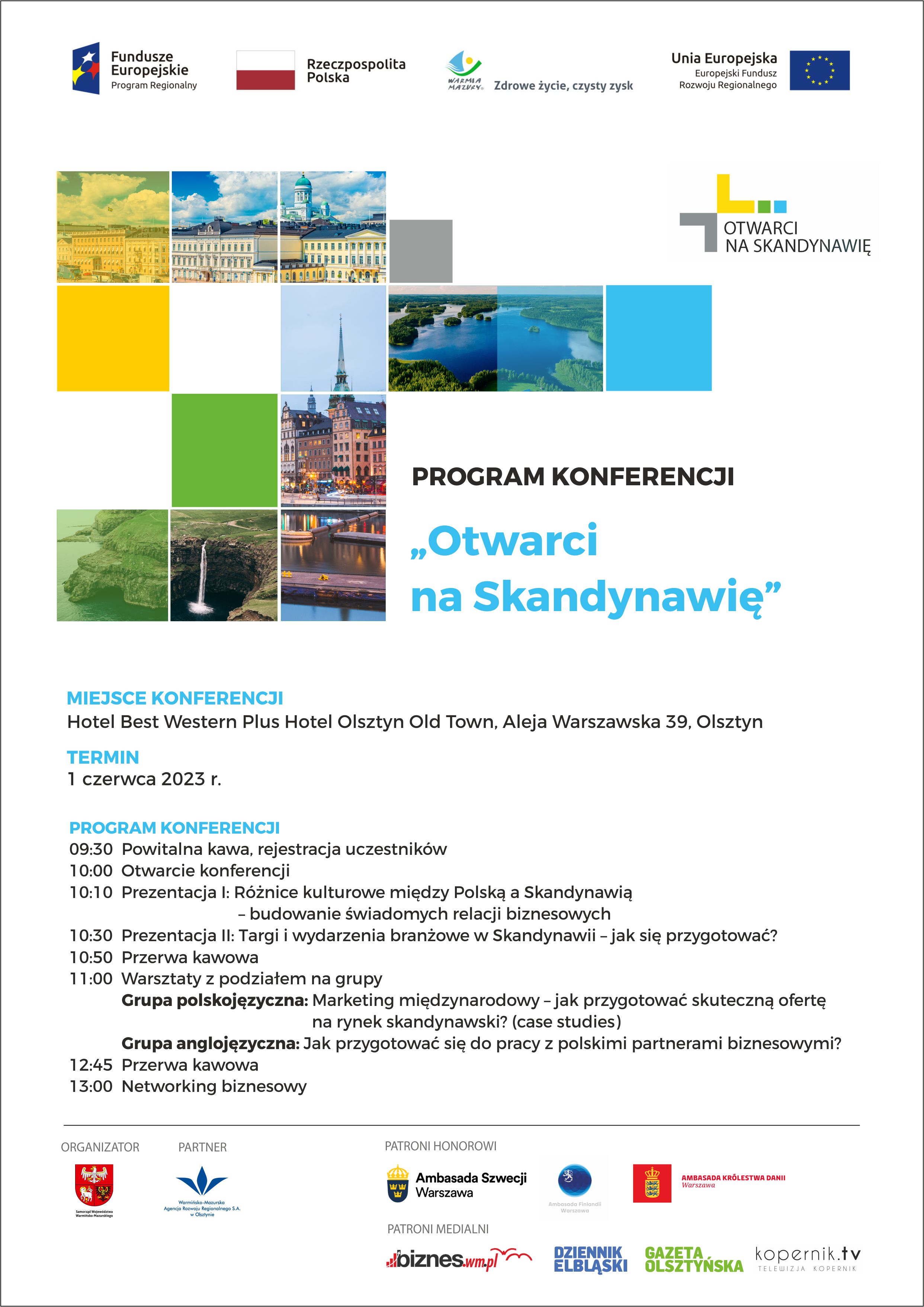 Wydarzenie „Otwarci na Skandynawię” realizowane jest w ramach projektu „Promocja gospodarcza Warmii i Mazur 2020+” dofinansowanego ze środków Europejskiego Funduszu Rozwoju Regionalnego w ramach Regionalnego Programu Operacyjnego Województwa Warmińsko-Mazurskiego na lata 2014-2020.