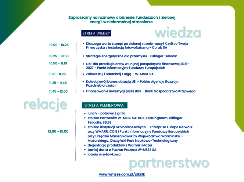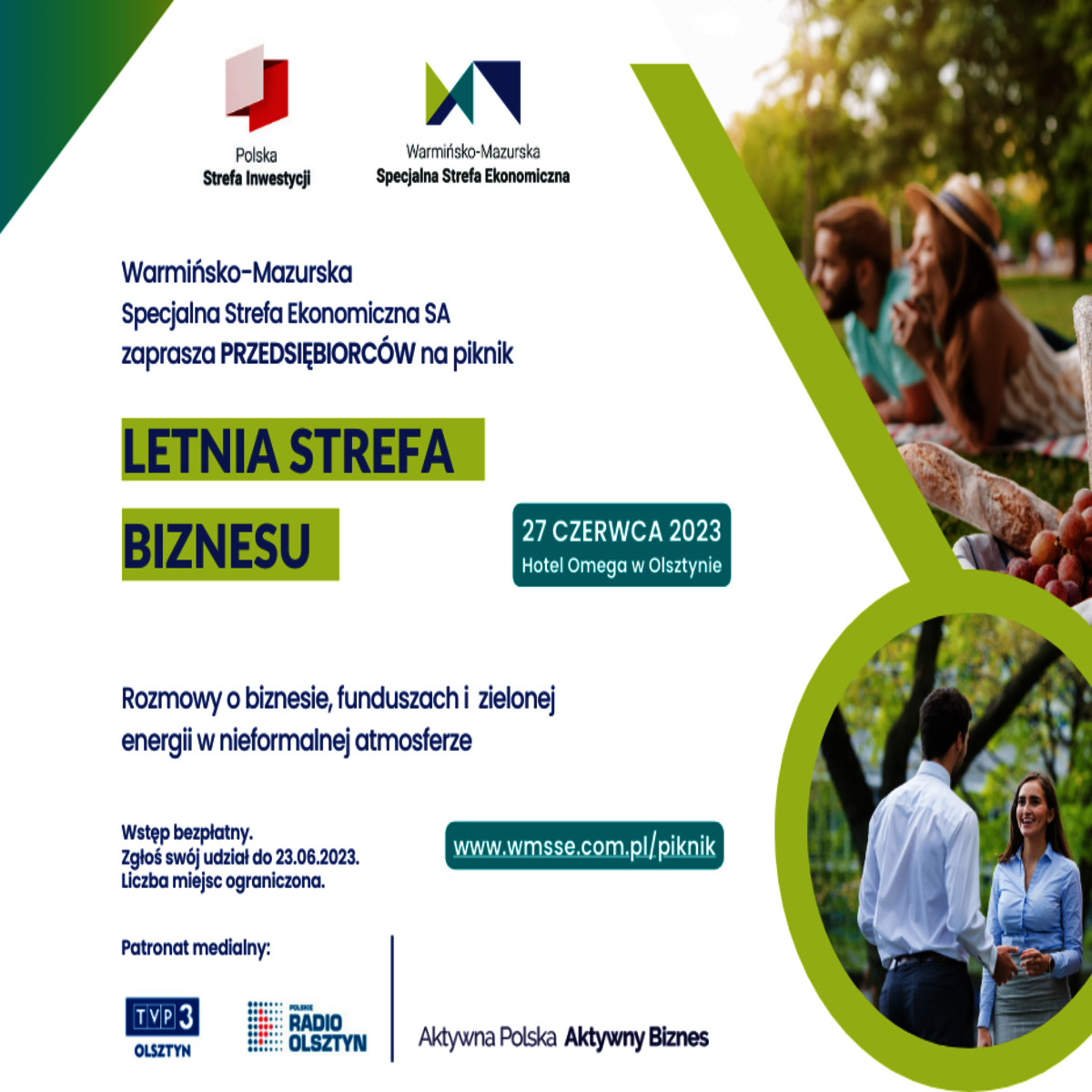 Warmińsko-Mazurska Specjalna Strefa Ekonomiczna SA serdecznie zaprasza na "Letnią Strefę Biznesu", czyli PIKNIK PRZEDSIĘBIORCÓW, który odbędzie się 27 czerwca 2023 r. w Olsztynie, w Hotelu Omega (ul. Sielska 4A). Start o godzinie 10.00.