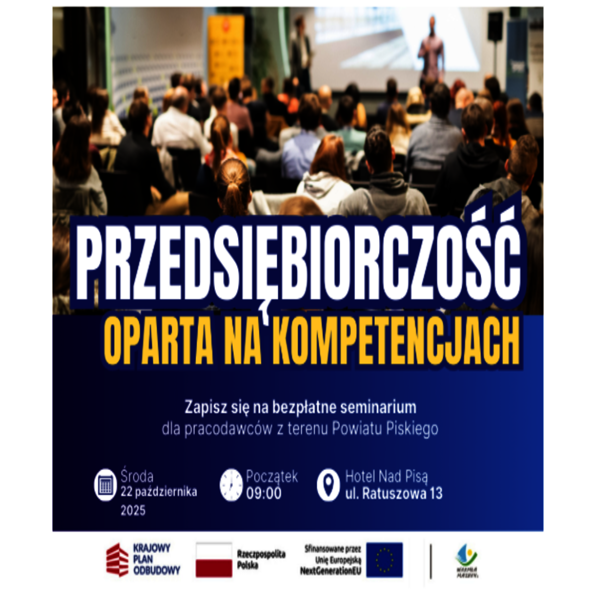 Zapraszamy do udziału w seminarium „Przedsiębiorczość oparta na kompetencjach”, które odbędzie się 22 października 2025 r. w sali konferencyjnej Hotel Nad Pisą ul. Ratuszowa 13 Pisz.