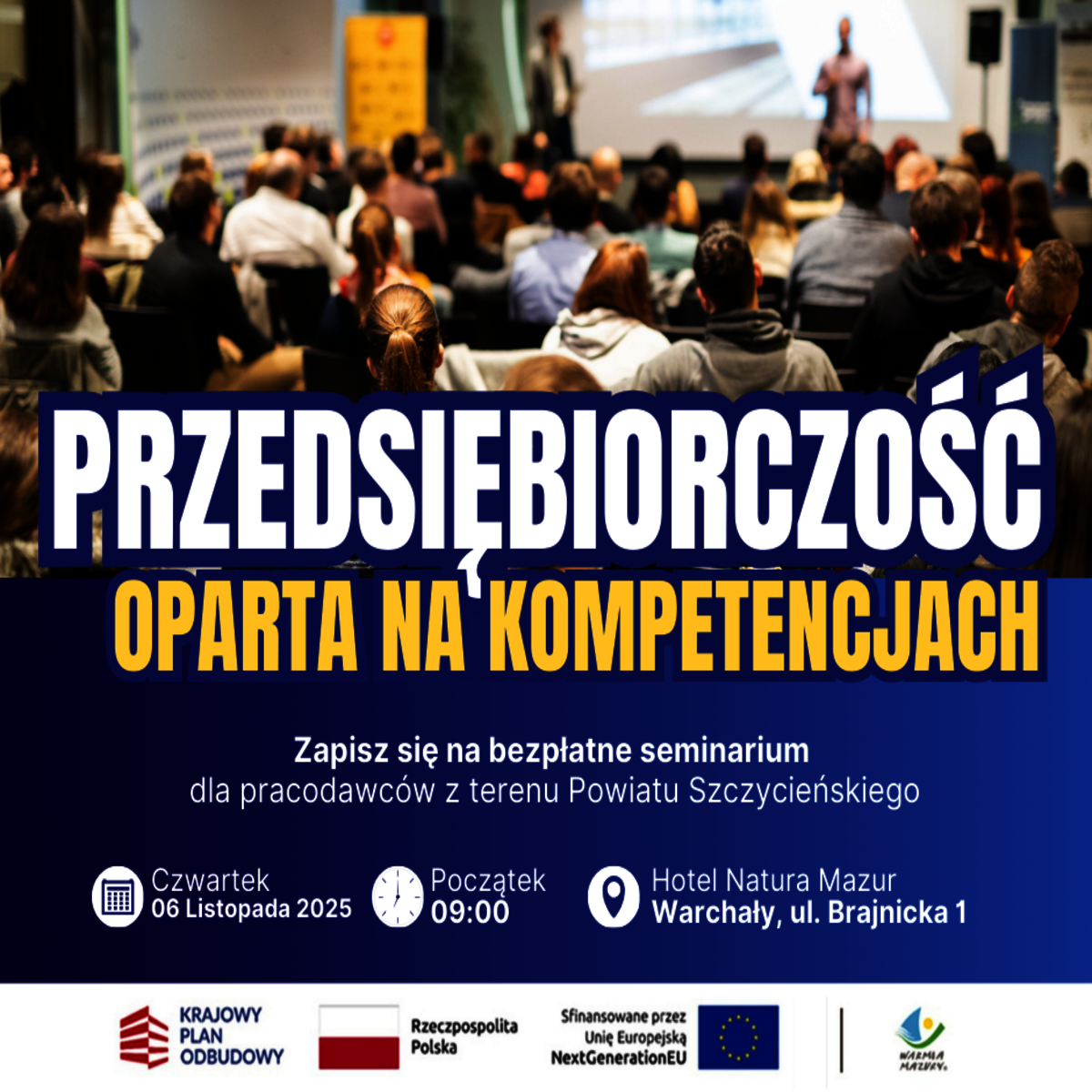 Zapraszamy do udziału w seminarium „Przedsiębiorczość oparta na kompetencjach”, które odbędzie się 6 listopada 2025 r. w Hotelu Natura Mazur Resort & Conference Warchały, ul. Brajnicka 1, 12-122 Warchały.