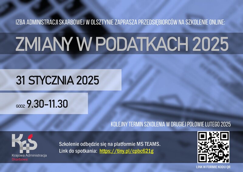 Krajowa Administracja Skarbowa w Olsztynie zaprasza do udziału w szkoleniu online „Zmiany w podatkach 2025”, podczas którego eksperci omówią najważniejsze aktualizacje w przepisach podatkowych na nadchodzący rok.